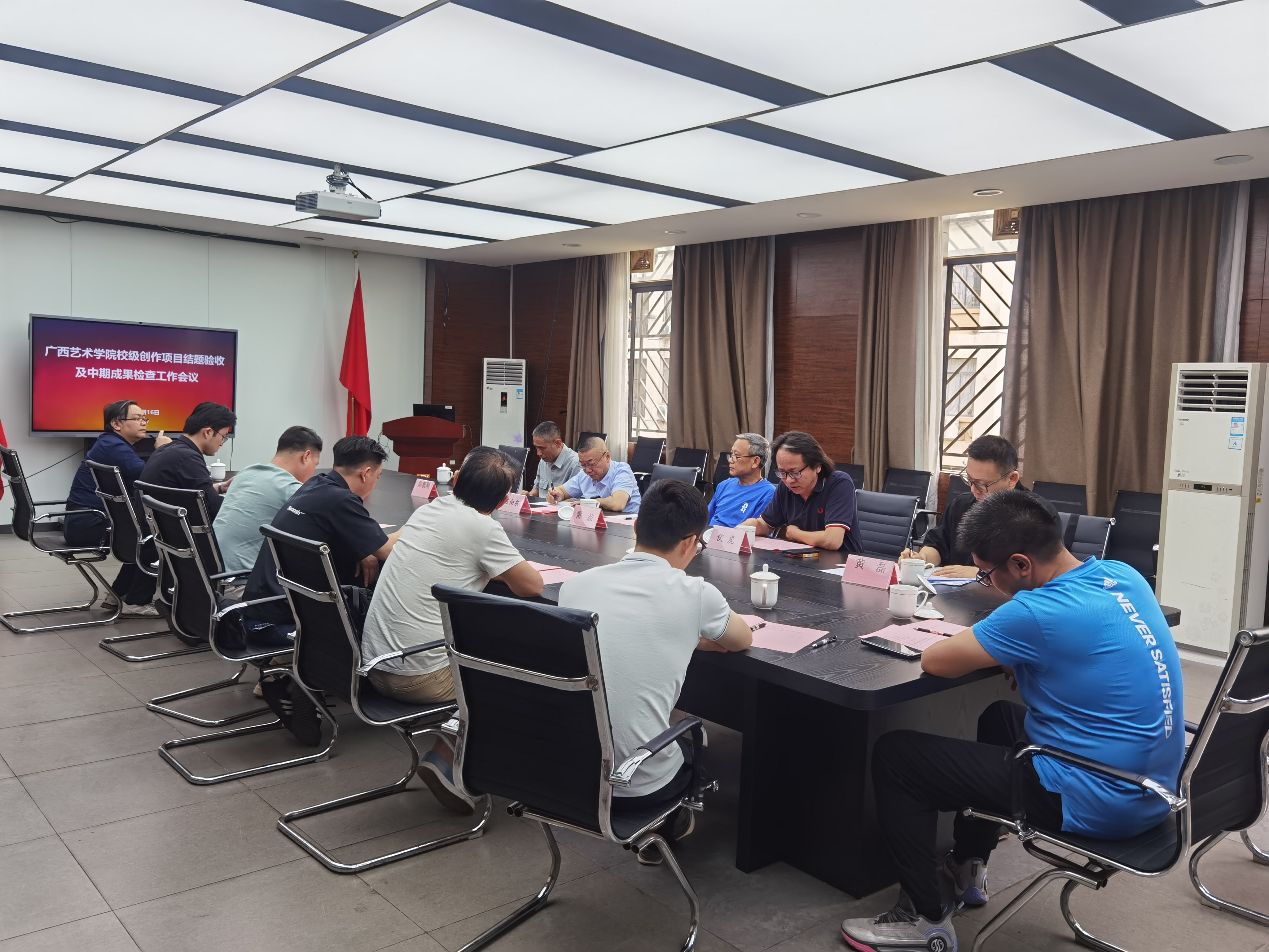 2025年4月16日下午,校级重大创作项目结题验收及中期成果检查工作,在学校相思湖校区美术学院会议室召开。会议特邀中国油画学会副会长雷波、广西美术家协会副主席陈毅刚作为专家出席,校党委常委、副校长伏虎,广西美术家协会主席、学校副校长石向东,科研创作处领导与相关项目负责人参加了本次检查工作。